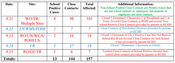 We have had 24 school days and 41 COVID-19 in school positive cases, both active and recovered and that is with a district-wide mask mandate. Eleven close contacts have changed to positive cases after numbers were reported. We will continue to rigidly mitigate to prevent widespread positives at a site or throughout the district. Currently, the positive cases in our schools appear to be isolated among sites or classrooms, but positives are widespread throughout families living in the same household, so it is critical we remain diligent with wearing face coverings and social distancing. In-person instruction, for Option 1 Learners, will continue the week of September 28-October-2.