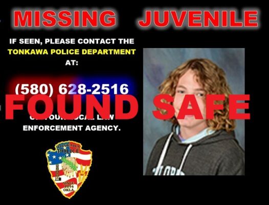 The Tonkawa Police Department shared on Facebook Monday night that 16-year-old Tyson Skipper was found and is safe with his family. Tyler went missing at around 11:30 a.m. Monday morning. Tonkawa police is thankful to the community who provided information on his whereabouts.