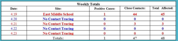 The District will continue to maintain the PCPS Contact Tracing Totals spreadsheet on their home page at www.pcps.us, so patrons may remain updated on numbers and percentages of those affected by COVID-19, either through isolation and quarantine. However, the numbers have been very low the past couple of weeks. If this continues, PCPS will not report weekly totals each weekend.