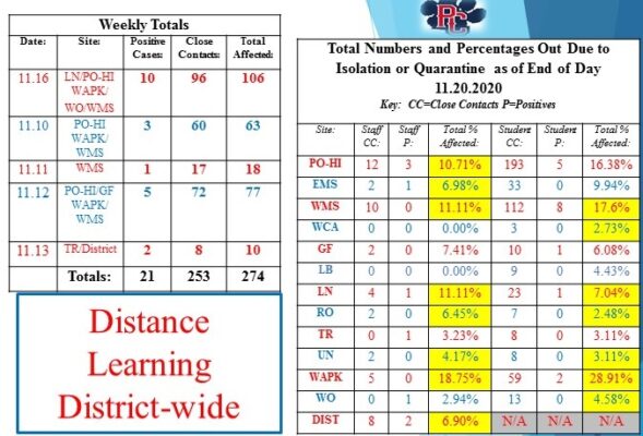 The COVID Alert System Risk Level increased this week from 68.6 – Red Level High Risk to 85.5 – Red Level High Risk. The last two weeks were the first weeks Kay County moved into the Red Level High Risk of the State Department of Education’s Risk Level map. The Red Level High Risk reflects an average of 50 new cases a day based on a 7-day rolling average per-capita of 100,000. Based on Kay County’s population, the trigger to move into the Red Level High Risk is a weekly average of 21.77 new cases per day. These alarmingly high rates have impacted the PCPS district.