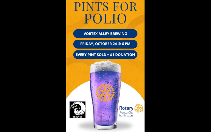 Join the Ponca City Trailblazers Rotary for our 3rd Annual Pints for Polio fundraiser on World Polio Day – Friday, October 24th at 6:00 PM at Vortex Alley Brewing.