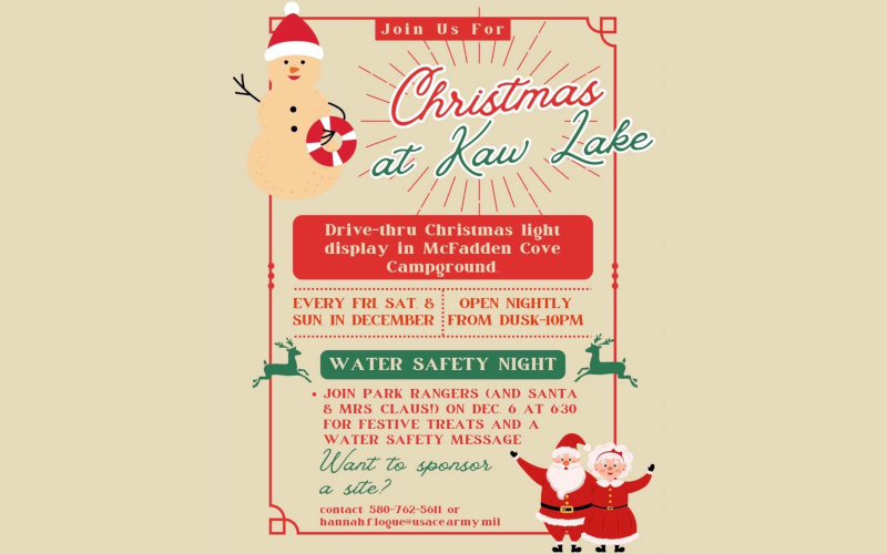 Experience the magic of the holidays at Christmas at Kaw Lake, a festive drive-thru Christmas light display set in the beautiful McFadden Cove Campground. Enjoy sparkling lights, cheerful decorations, and a peaceful holiday atmosphere — all from the comfort of your vehicle.