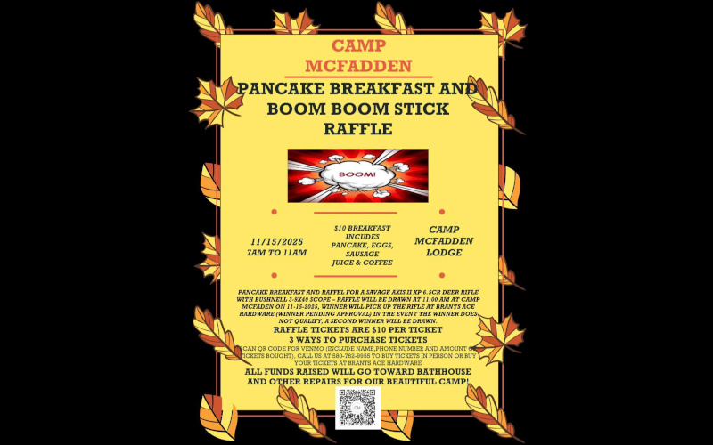 Attention Hunters!! We will be hosting a pre Deer G** Season Breakfast on Nov 15th with a chance to win a new Boom Stick! Raffle tickets are now available! Scan the code below, visit Brandts Ace Harware(3203 N. 14th St.) or give us a call(580) 762-9955) to get your tickets!!!