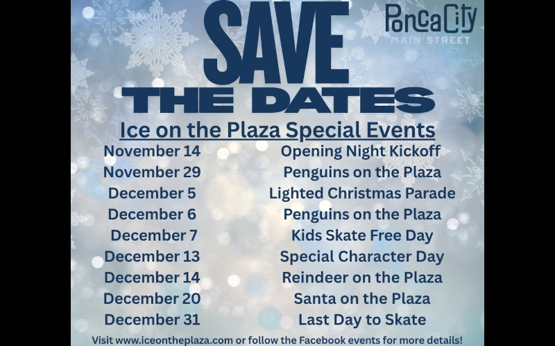 Enjoy holiday lights, music, and winter fun all season long at Veteran’s Plaza in the heart of downtown Ponca City. Visit iceontheplaza.com or follow Ponca City Main Street on Facebook for event times, ticket information, and updates.