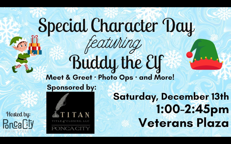 Ponca City Main Street invites you to an enchanting afternoon at Veterans Plaza sponsored by Titan Title & Closing! ❄️Bring the whole family for a meet & greet with Buddy the Elf. Enjoy special interactions that capture the spirit of the story and FREE photo opportunities.