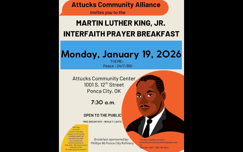 The Attucks Community Alliance invites the community to come together in reflection and unity at the Martin Luther King, Jr. Interfaith Prayer Breakfast on Monday, January 19, 2026, at 7:30 a.m. at the Attucks Community Center (1001 S. 12th Street, Ponca City).