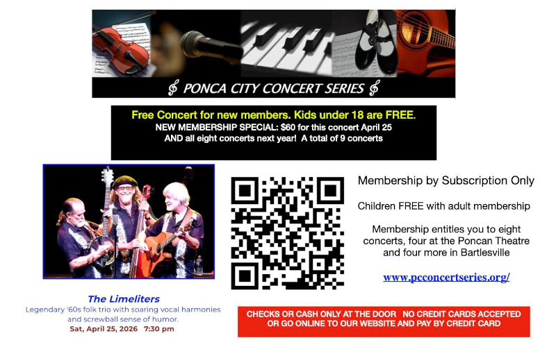 Get ready for an unforgettable evening of music as the Ponca City Concert Series welcomes The Limeliters, a legendary ‘60s folk trio known for their soaring vocal harmonies and signature sense of humor!