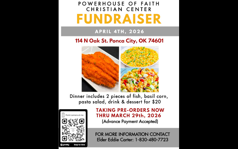 Join Powerhouse of Faith Christian Center for a delicious community fundraiser on Saturday, April 4th, 2026 in Ponca City!