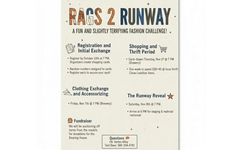 On November 1st we gather and draw for our secret model. Then you have 1 week to shop at one of Ponca City’s thrift stores.