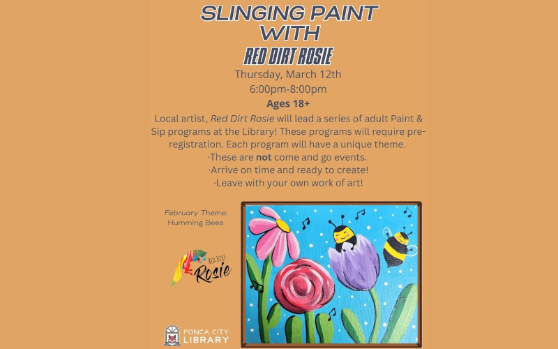 Unleash your creativity at the Ponca City Library during Slinging Paint with Red Dirt Rosie, a fun and relaxed Paint & Sip style event designed for adults! Local artist Red Dirt Rosie will guide participants step-by-step through creating their own colorful masterpiece in a welcoming, creative atmosphere.