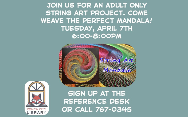 Get creative and unwind with a fun, hands-on art experience at the Ponca City Library! Join us for a String Art Mandala Workshop where you’ll design and weave your own beautiful mandala using colorful string patterns.