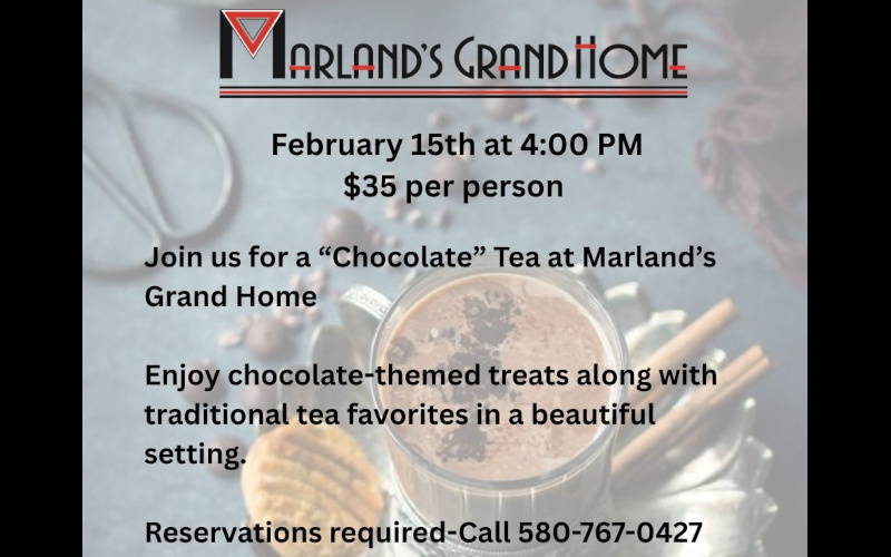 Indulge in a delightful afternoon at a “Chocolate” Tea at Marland’s Grand Home on Saturday, February 15th at 4:00 PM. Guests will enjoy an elegant tea experience featuring chocolate-themed treats alongside traditional tea favorites, all served in the beautiful and historic setting of the Grand Home.