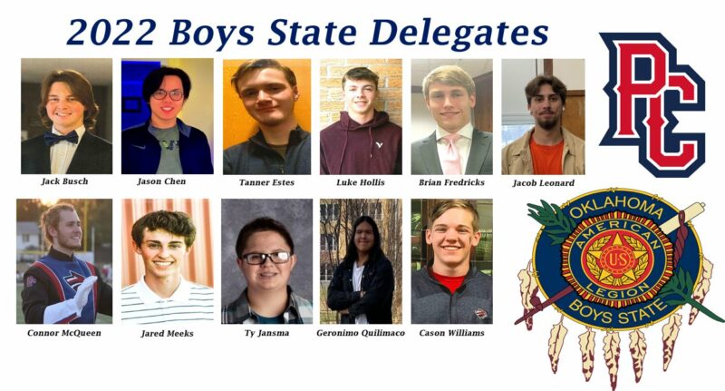 Oklahoma Boys State was held May 28 through June 4, 2022, on the campus of Rogers State University. A total of 11 boys represented Ponca City High School at the event including Bingnan Jason Chen, Brian L. Fredricks, Cason D. Wilson, Connor Owen McQueen, Geronimo Quilimaco Jr., Jack F. Busch, Jacob Russell Leonard, Luke Hollis, Jared Cadin Meeks, Tanner Clerke Estes and Ty Wyatt Jansma.