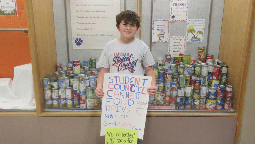 The Lincoln Elementary Student Council challenged students and staff to collect canned food to help families in need. The drive lasted from Nov. 1-17 with a goal of 500 cans. Members went to each classroom in the morning to collect cans and count them. Canned goods were put in the display cases so everyone could see the progress. The goal was exceeded by collecting 647 cans. Student Council kids loaded all the cans into a truck this morning, and the cans were taken to The Mission.