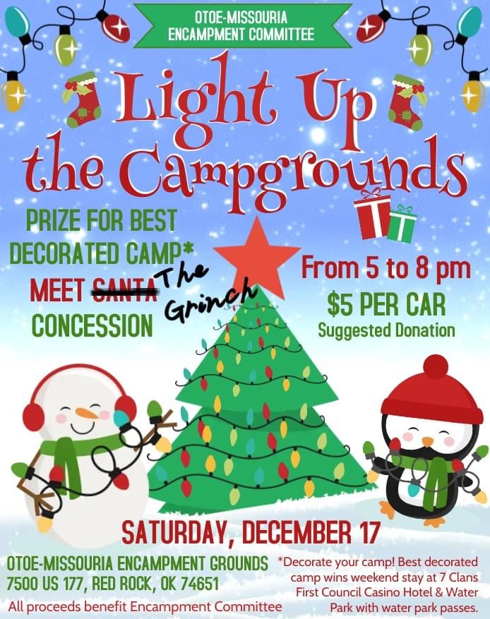 The Otoe Missouria Encampment Committee invites you to take part in Light Up The Campgrounds – a holiday celebration featuring beautiful Christmas decorations, concessions and a chance to meet the Grinch, this Saturday, December 17th, from 5 ‘til 8pm at the Otoe Missouria Encampment Grounds in Red Rock. Admission is a suggested $5 per carload.