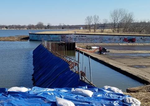 A temporary cofferdam with active dewatering and bypass system is being used to avoid the lake level lowering during construction, so that recreational activities are not affected.