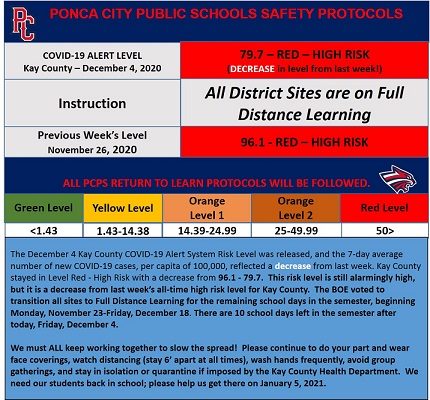 The December 4 Kay County COVID-19 Alert System Risk Level was released, and the 7-day average number of new COVID-19 cases, per capita of 100,000, reflected a decrease from last week. Kay County stayed in Level Red – High Risk with a decrease from 96.1 – 79.7. This risk level is still alarmingly high, but it is a decrease from last week’s all-time high risk level for Kay County. The BOE voted to transition all sites to Full Distance Learning for the remaining school days in the semester, beginning Monday, November 23-Friday, December 18. There are 10 school days left in the semester after today, Friday, December 4.