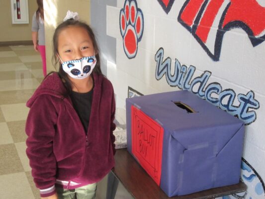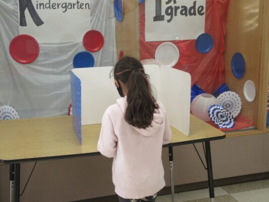 Pictured middle: Victoria Hinman 1st Grade (casting her vote in the voting booth)