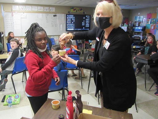 Pictured top left: Ny’ree Coburn 4th Grade (enjoying her ice cream) & Asst. Principal Dawn Mills (serving ice cream to students)