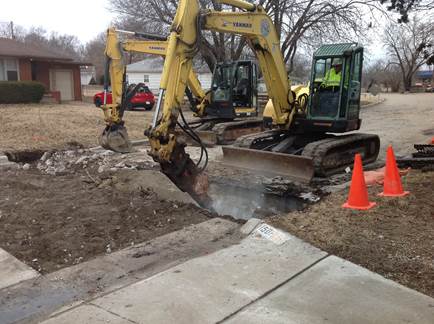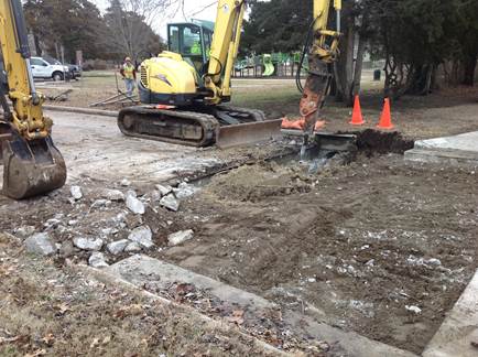 Photo captions: Ongoing work to remove the existing trench box, located in the 1500 block of McGraw Drive.