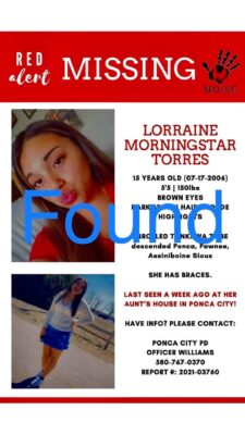 A Red Alert is no longer in effect for Lorraine Morningstar Torres of Ponca City since she’s been found. Torres went missing on October 7th after being at her aunt’s house in Ponca City. 12 days later on October 19, MMIP of Northern Oklahoma Indian Territory shared the news that she was found.