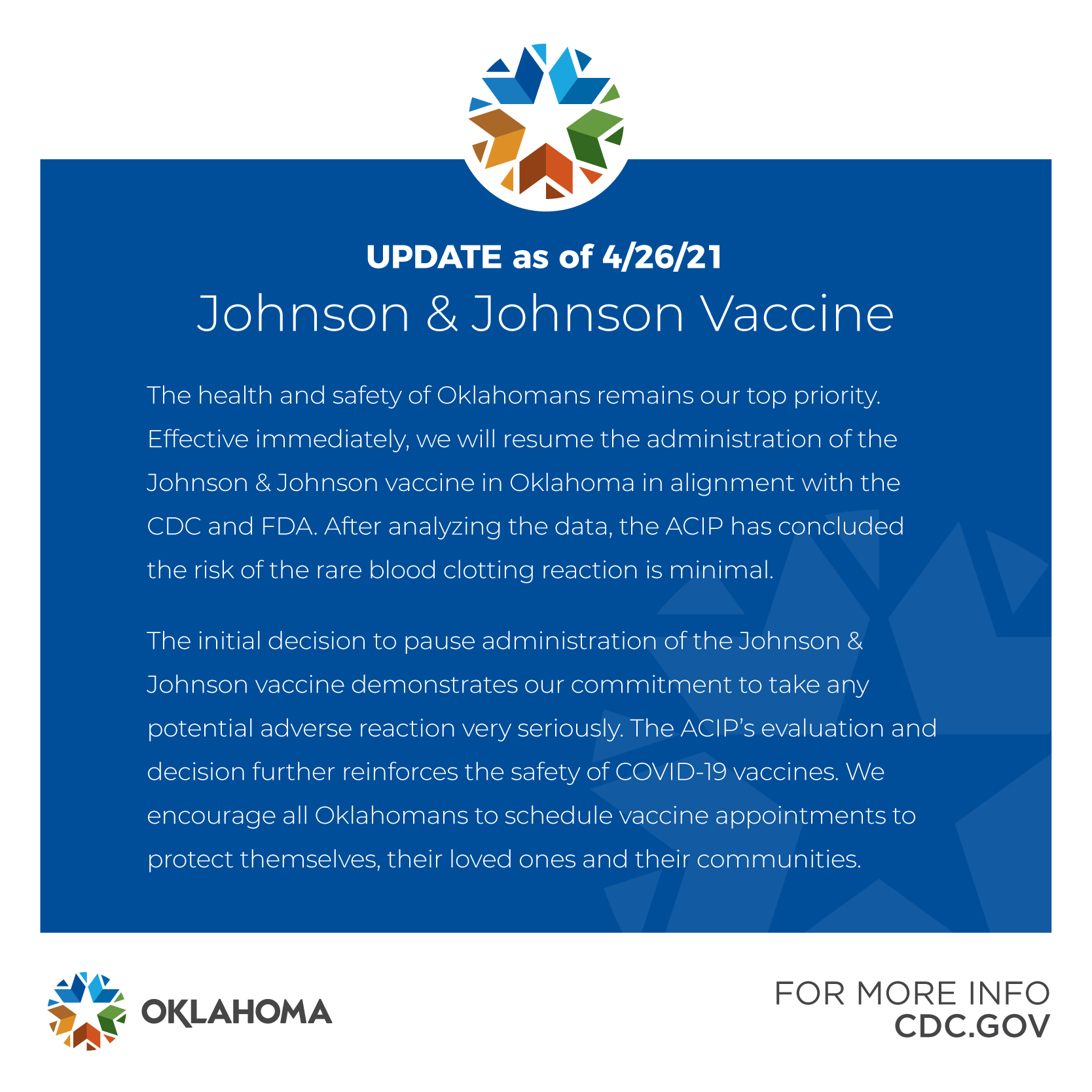 The Oklahoma State Department of Health announced Monday that they will resume administration of the Johnson & Johnson vaccine in Oklahoma in alignment with the CDC and FDA. After carefully analyzing the data, the ACIP concluded the risk of the rare blood clotting reaction is minimal.