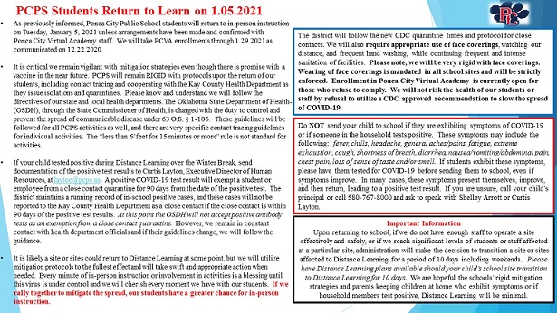 HomeLocalPonca PostPCPS to return to in-person learning on TuesdayPCPS to return to in-person learning on TuesdayMon, January 4, 2021 by Lyman JamesSHARE NOW