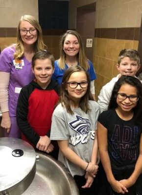Pictured top right: Jennifer Delaney (Nursing Instructor & Woodlands Mom), Caitlin Moore (Nursing Student), 5th Graders Logan Ross, Addison Diedrich, Blake Austin, & Haley Maples