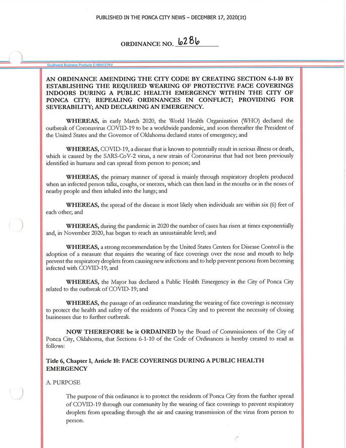 The following is Ordinance 6-1-10 provided by the City of Ponca City: