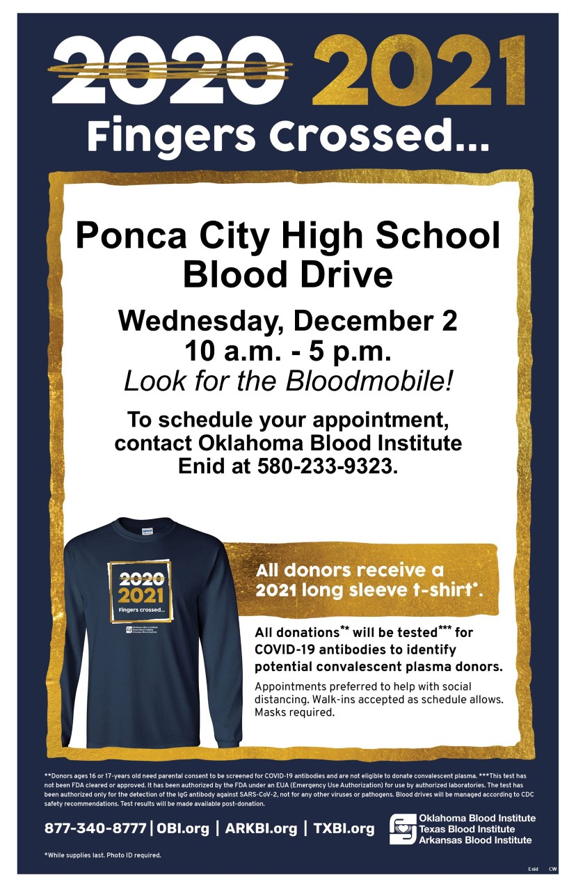 On Wednesday, December 2, 2020, Po-Hi Student Council (minus the students) will hold a blood drive in the parking lot of the Concert Hall in the Bloodmobile from 10:00 a. m. until 5:00 p.m. Since we will not have our usual turnout of high school student donors, we are looking for help from district employees and friends and family to help us make our goal! All donors will receive a free long sleeve shirt! (Picture attached) All donations will also be tested for COVID-19 antibodies. They are strongly encouraging those who have had a COVID-19 previous diagnosis to consider donating convalescent plasma because donations are used in hospitals as a way to help struggling patients fight off the virus. Please make an appointment using the link below or call the Oklahoma Blood Institute in Enid at 580-233-9323.