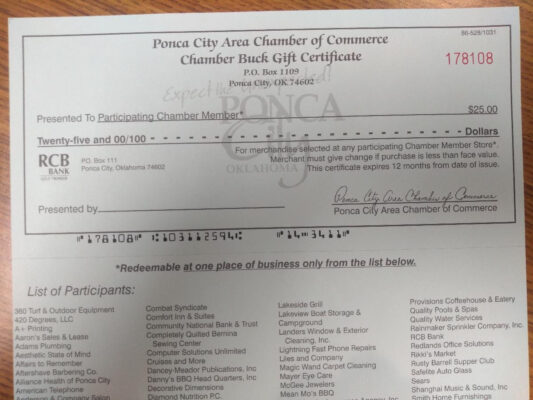 The Ponca City Chamber of Commerce is reporting an issue with their Chamber Bucks program. The Chamber has someone that is making copies of Chamber Buck Check #177981 and taking them to area businesses. Several have taken these fake Chamber Bucks not knowing they are not legit.