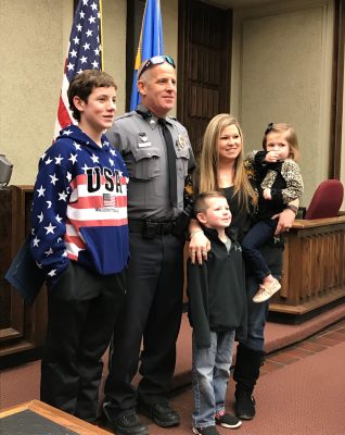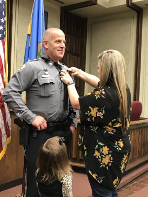 (Pictured with Dana Fisher pinning on his badge is his wife Chelsea and youngest daughter Rylee)