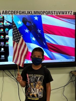 The student holding the flag recording his message is first grader, Jaedon Arkeketa. Mrs. Webb is the teacher. (2 pictures)